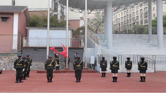 仪式开始,英姿飒爽的国旗护卫队护送国旗进场。国歌声起,护旗手振臂挥动,五星红旗迎风飘扬。全场师生肃立,深怀对祖国无限热爱和崇高的敬意,向国旗行注目礼。鲜艳的五星红旗同初生太阳升起,朝气蓬勃、充满希望。