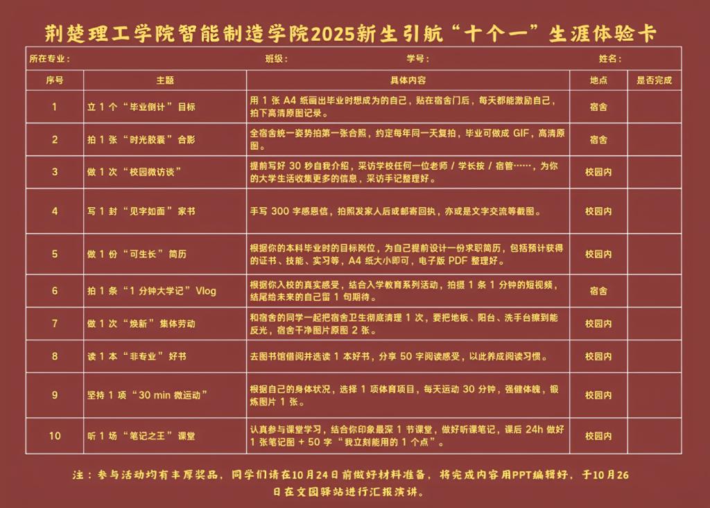 活动现场,新生们的汇报真挚而热烈。从“读一本‘非专业’好书”中探索人生智慧,到以一纸家书传递对亲人的牵挂;从“笔记之王”课堂中领略学海的深度,到“立‘毕业倒计’目标”中锚定前行方向。此外,“时光胶囊”合影定格青春风采,“校园微访谈”汇聚大学生活多元声音,“可生长”简历勾勒职业发展路径。活动还鼓励同学们用Vlog记录入学初体验,通过集体劳动共筑温馨宿舍,并以“微运动”强健体魄、磨砺意志。