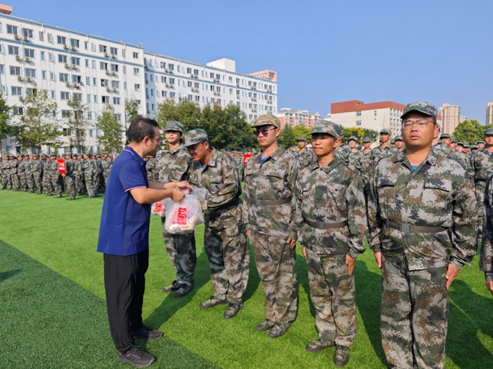 随后,姜全新和杨晓明两位老师向学生代表发放中秋节慰问礼物。并合影留念。