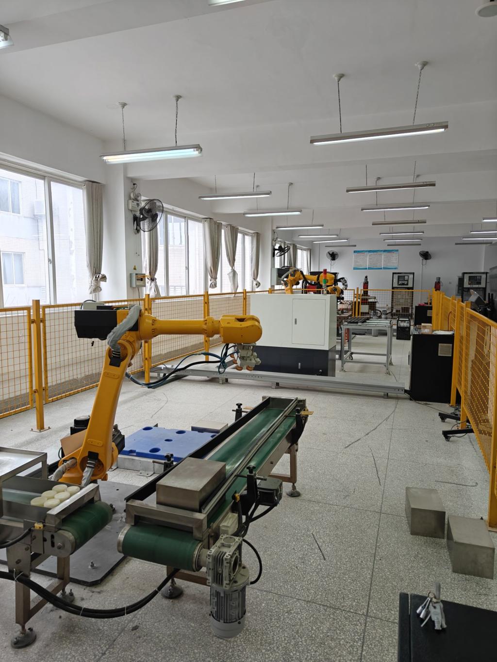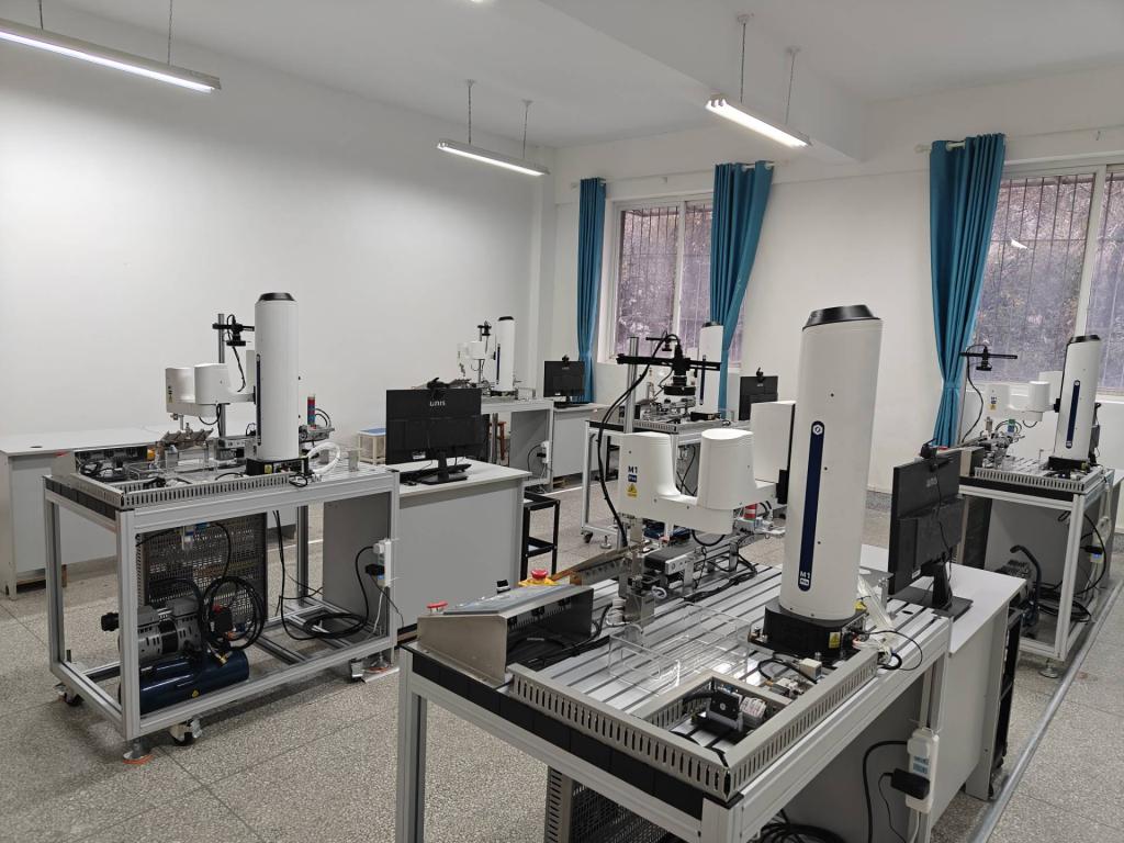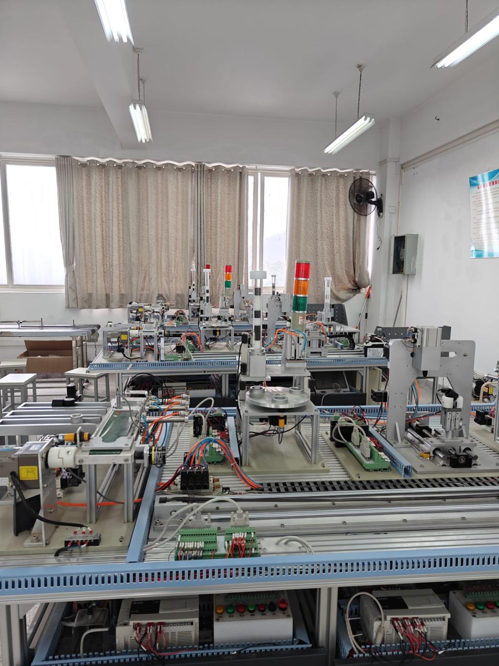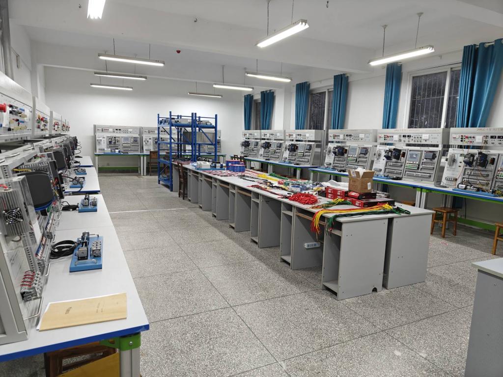 现代制造技术实验中心由机电一体化实验室、工业机器人实训室、夹具拆装实验室、PLC工业控制实验室、人工智能与机器视觉实验室组成