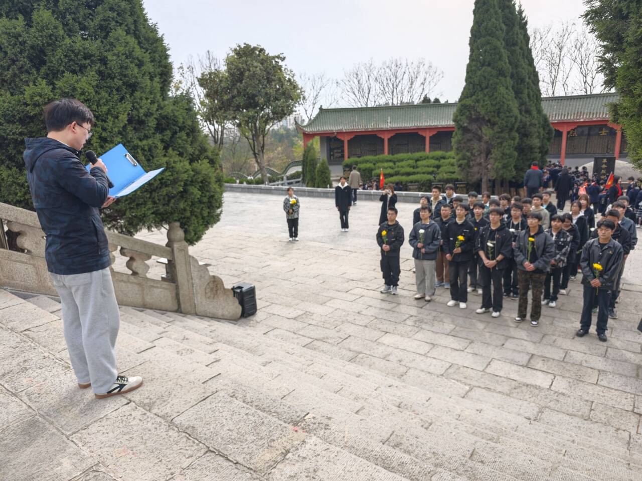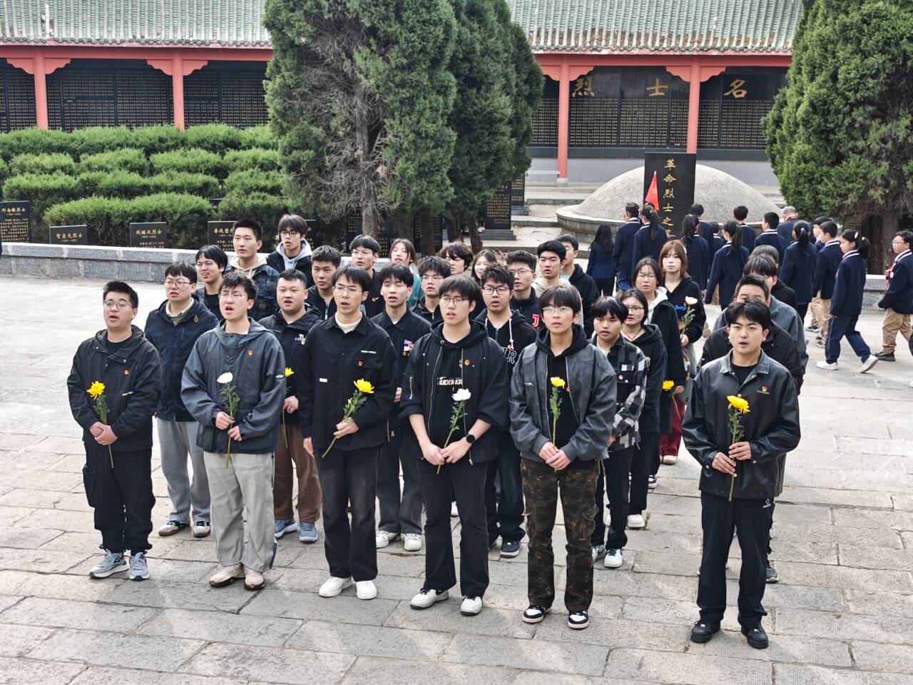 随后,学生代表夏一航带领全体学生重温入团誓词,铿锵有力的誓言在烈士陵园上空回荡,展现了新时代青年继承先烈遗志、勇担历史使命的坚定信念。最后,师生们缓步绕行纪念碑,将寄托哀思的菊花轻轻敬献在纪念碑基座上。朵朵菊花承载着后人的无限追思,象征着革命斗争精神必将代代相传,在实现中华民族伟大复兴的征程中绽放新的时代光芒。