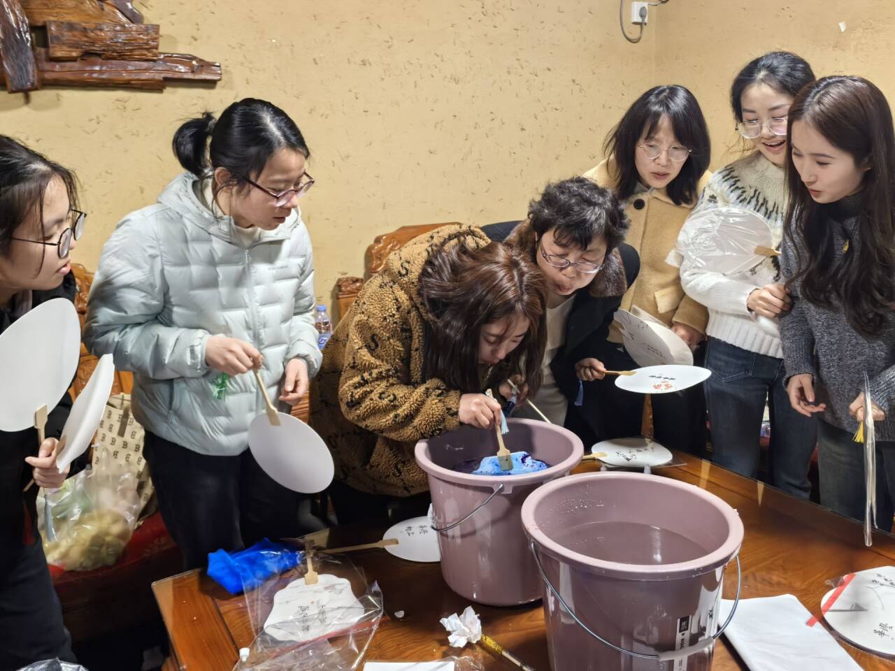 活动现场,老师们踊跃参与,以个人爱好调配色调,创造出丰富多彩的漆扇作品。